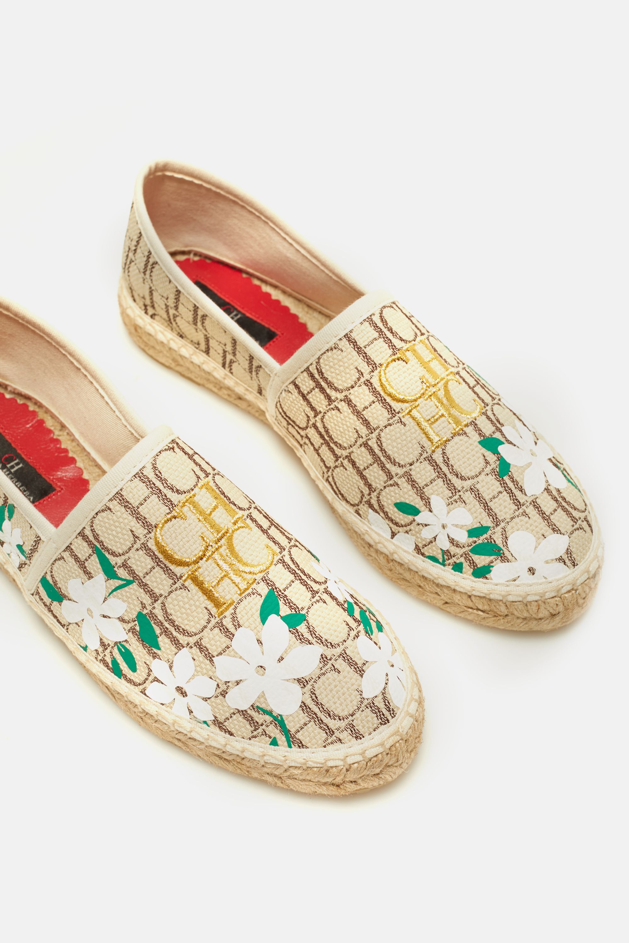A tuxedo slipper and an espadrille adorned with the house’s signature jasmine flower in rubberized ink on top of canvas. The final detail is the logotype embroidered in golden thread. Designed with Footwear Director David Baz as a member of the CH Carolina Herrera Design Team in Spain.